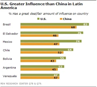 Kína növekvő jelenléte, és néhány magas rangú politikus körútja a kontinensen nem véletlen. Egy könnyen járható és biztos útvonal ez, amin keresztül hatékonyan lehet ellensúlyozni az USA világgazdasági súlyát. Jelenleg még az Egyesült Államok a déli országok legnagyobb partnere, kapcsolatuk gyökereihez messzire kell visszatekinteni a múltba. Ellenben ez nem jelenti azt, hogy ezek a gyökerek olyan erősek lesznek a jövőben is, csak mert régiek. Az ábrán látni, hogy Kína befolyása a kontinensen szinte ugyanakkora, mint az USA jelenléte. Valószínűsíthető, hogy USA nem fogja szó nélkül hagyni Kínát, hogy megelőzze őt a népszerűségi listán. Nem szabad viszont elfelejtenünk, hogy nem olyan rég több latin-amerikai országban még diktatúra volt, vagy most is az van, és ez a berendezkedés közelebb áll Kínához, mint az Egyesült Államokhoz.